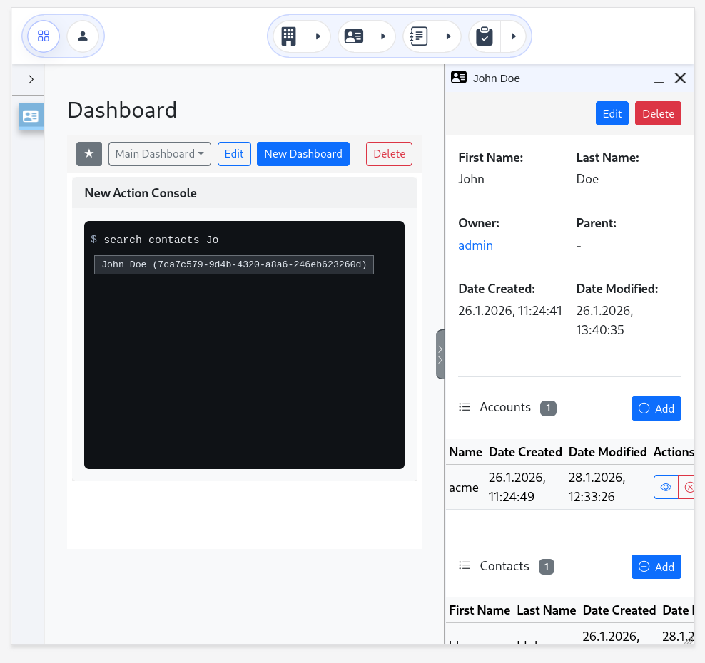 The Action Console is wired into the existing entity list API and WinBox windows: searches return live results, records open directly in windows, and new entity creation spawns a dedicated create window.